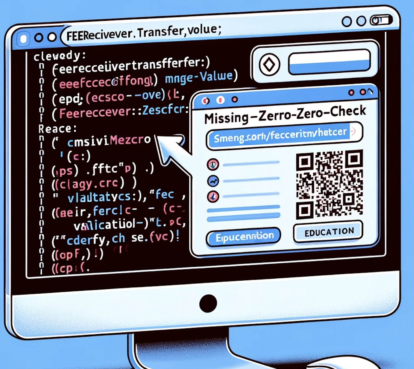 It includes an annotation for the 'missing-zero-check' vulnerability and features a representation of a clickable link or QR code for educational resources related to this specific issue.