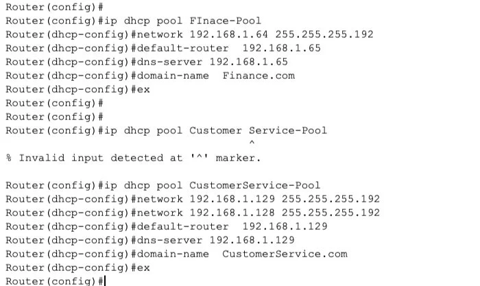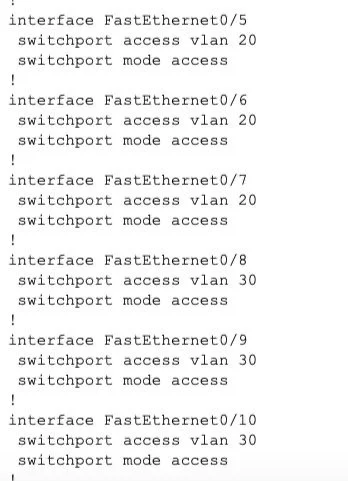 Defined VLANs on the switch to segment the network traffic: VLAN10 (Admin/IT), VLAN20 (Finance/HR) & VLAN 30 (CS).